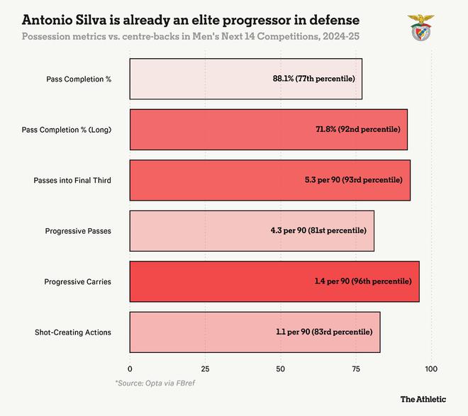 安东尼奥-席尔瓦的爆发比本菲卡预期的要早。2023年春天,伤病迫使当时还是青少年的他进入首发阵容。这场严峻的考验为这位年轻中卫注入了坚韧的意志,他甚至在欧冠比赛中对意大利老将博努奇摇手指,同时获得了一份续约至2027年的合同。